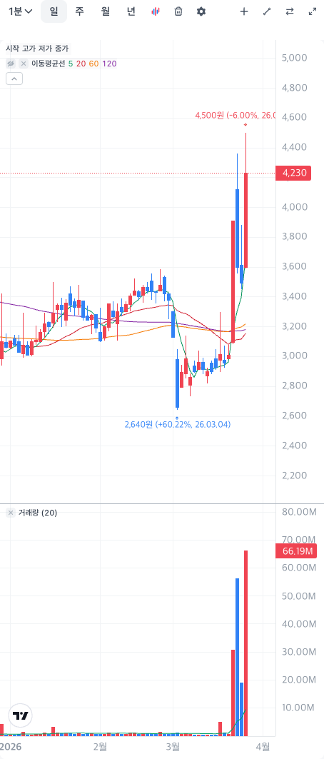 토스증권 주문 화면 기준으로도 이날 시장의 관심은 가격 급등과 거래대금 확대에 집중돼 있었습니다. 장중 고가가 4,500원까지 올라갔다는 점은 단순 반등이 아니라 상한가 부근까지 매수세가 밀어붙였다는 의미가 있습니다. 거래량이 6,556만 주를 넘겼다는 점 역시 단기 트레이딩 자금이 강하게 유입된 하루였다는 해석이 가능합니다.